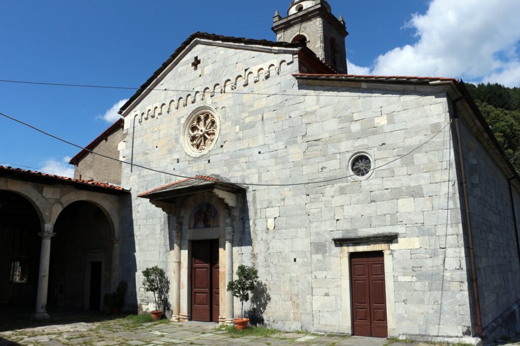 The first stop on the itinerary is the Romanesque Church of Santa Maria Assunta in Stazzema. It is located just outside the town, in a dominant position over the Vezza river valley below. According to some scholars, it was erected on the remains of a pagan temple already built by Roman soldiers and dedicated to Minerva. First mentioned in the 9th century, it has undergone considerable renovations and additions over time. It stands out for its bardiglio marble façade, with a 15th-century rose window decorated with hanging arches and corbels worked with figures of various kinds. The portico, added in the 17th century, is very striking. The interior features several works such as an Assumption of the Virgin by Pietro da Talata, a predella by Zacchia il Vecchio and a sculpture by Niccolò Civitali.