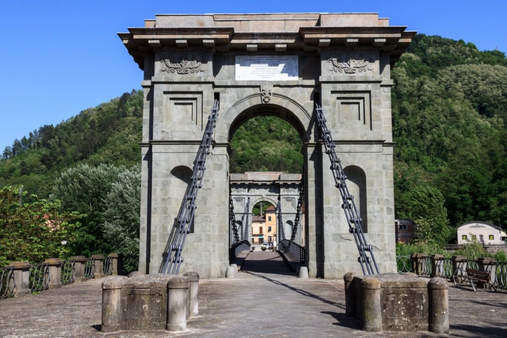 Located in Fornoli, a hamlet of Bagni di Lucca, the Ponte delle Catene is one of the first suspension bridges built in Italy as well as one of the oldest iron bridges still standing in continental Europe. Interesting both in terms of aesthetics and construction technique, it was erected between 1844 and 1860 on a commission from the Duke of Lucca, Carlo Ludovico di Borbone, and a design by Lorenzo Nottolini, an illustrious architect to whom we owe so many monuments and architectures. The work was based on the innovative use of industrial iron techniques, through the suspension with chains, and a complex underground mechanism that kept the chains in tension. Mined by the German military in 1944, it was rebuilt in 1953 based on the original design.