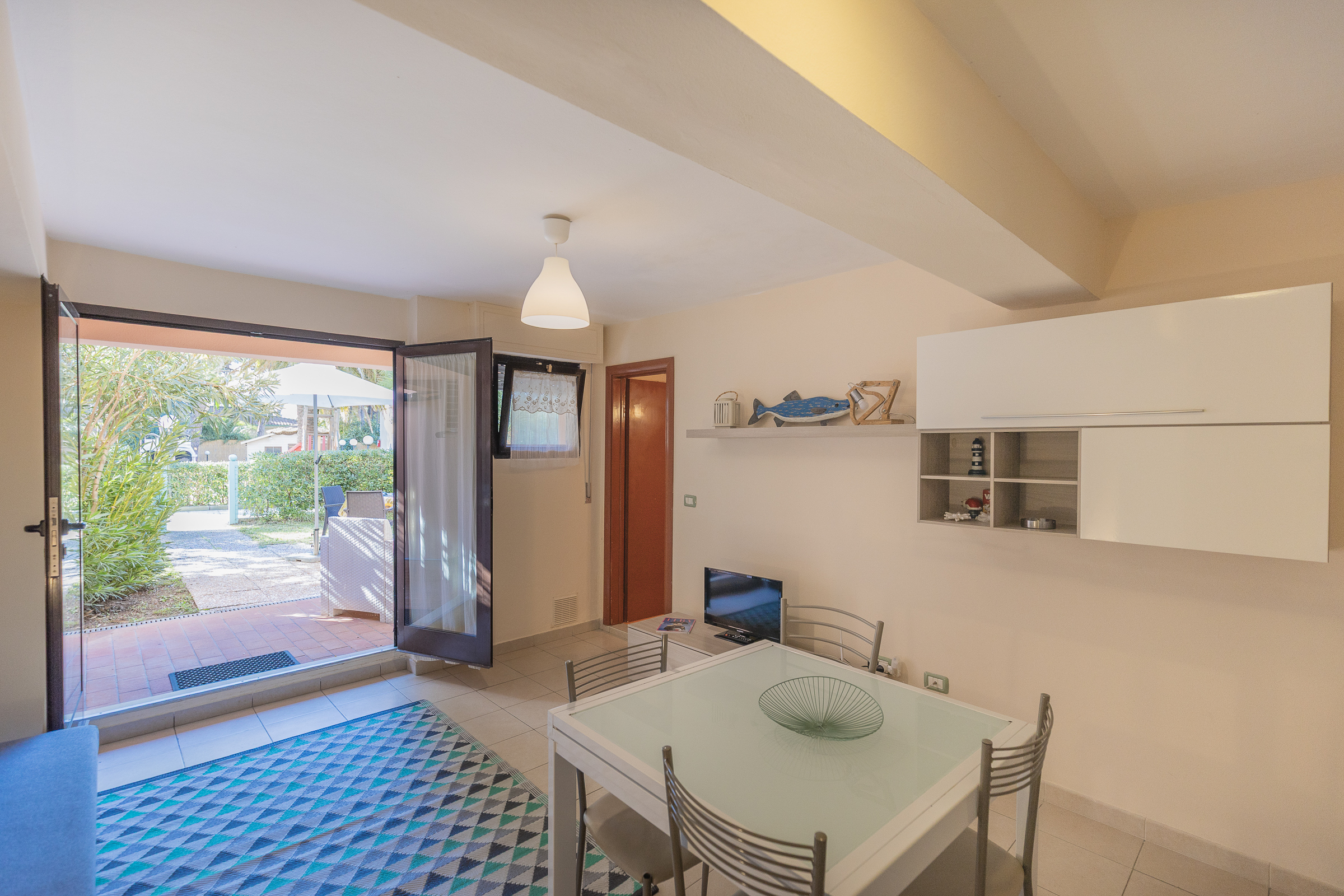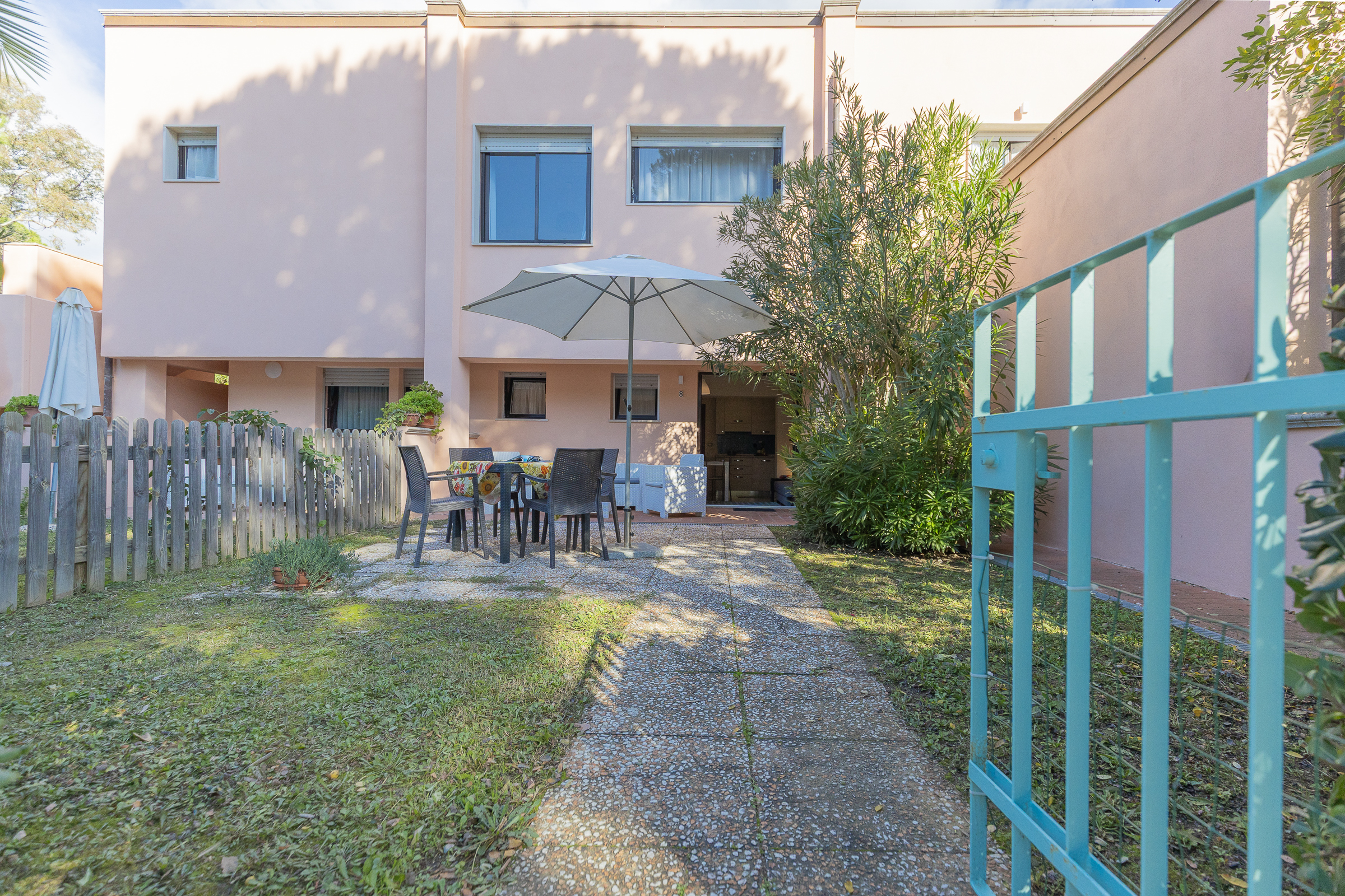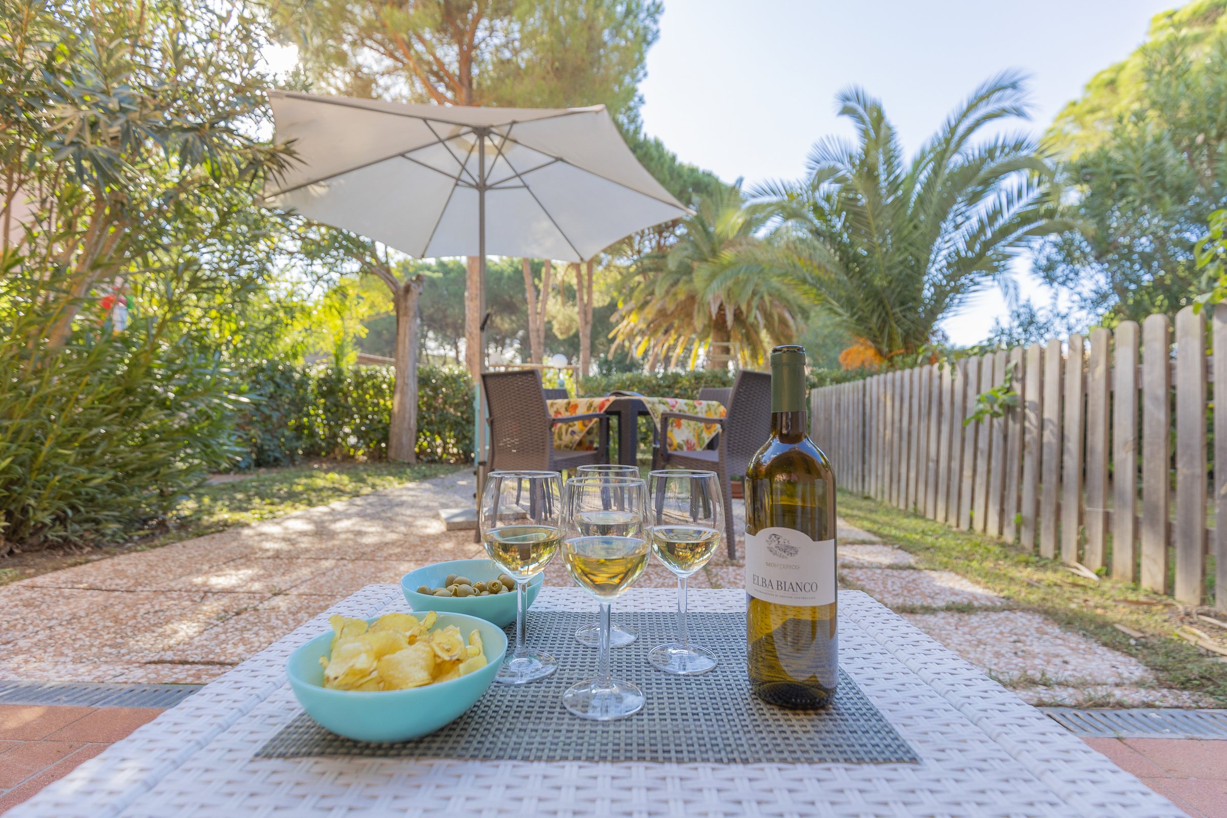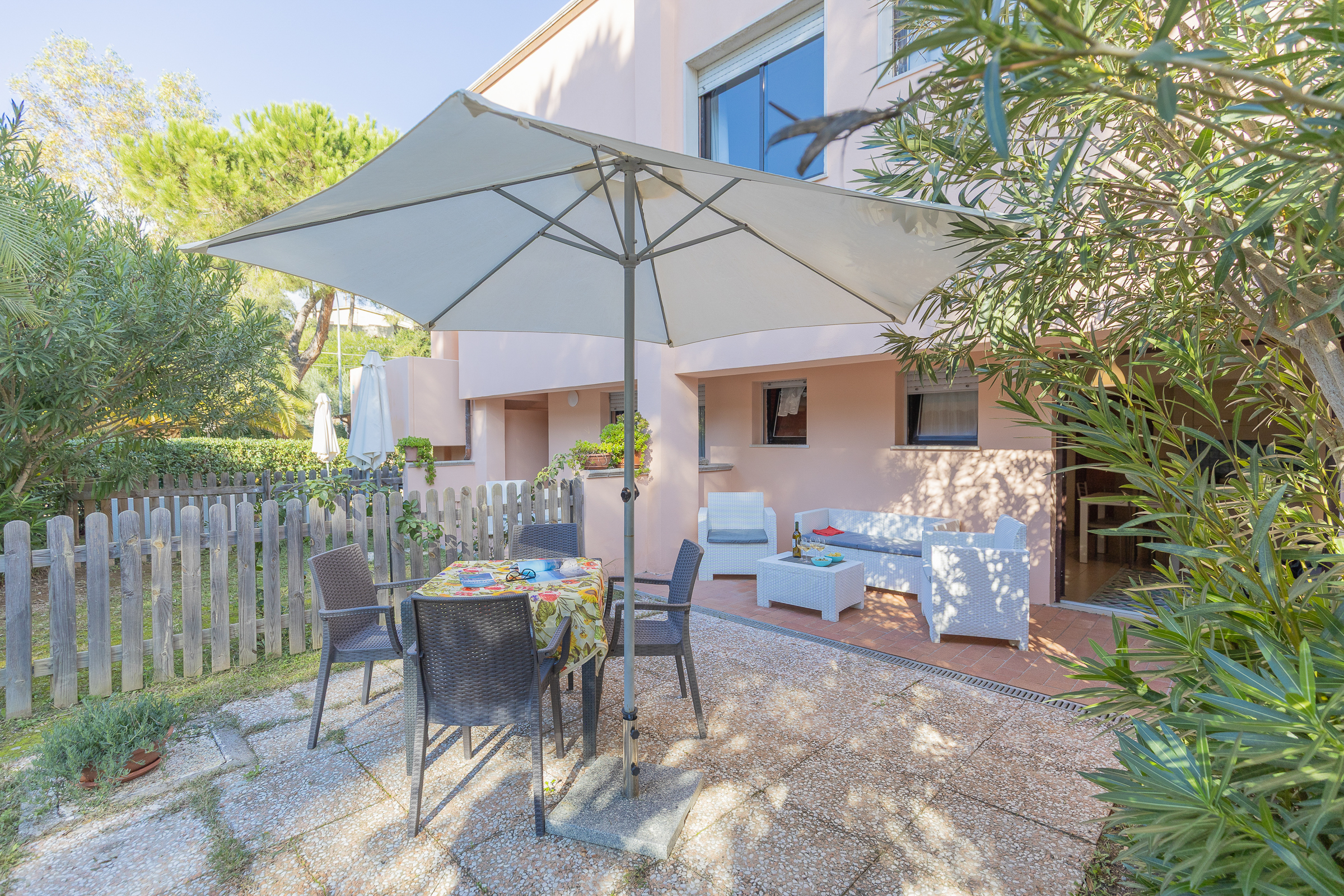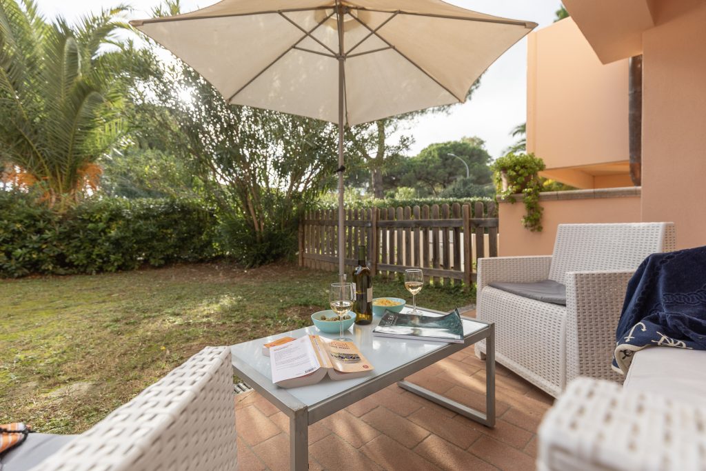 Ogni bilocale dispone di un piccolo giardino privato, arredato con tavolo, sedie, ombrellone e divanetti da esterno, perfetto per pranzi all’aperto e momenti di relax immersi nella tranquillità.
