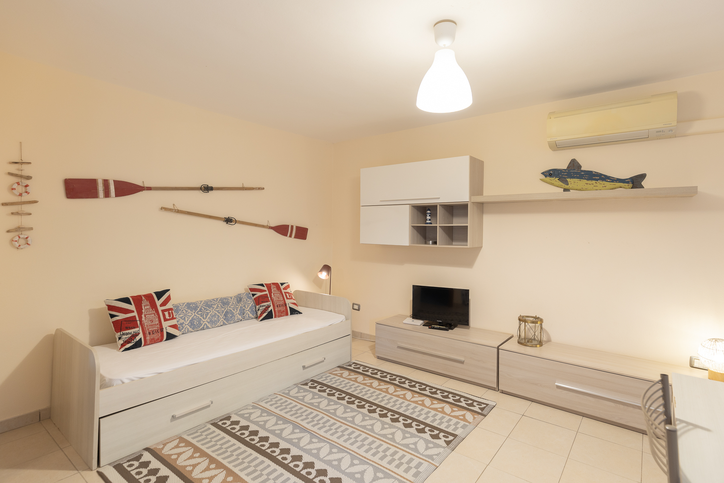 Tutti gli appartamenti presentano la stessa disposizione interna, composta da un soggiorno con angolo cottura e divano letto matrimoniale, una camera e un bagno con doccia.
